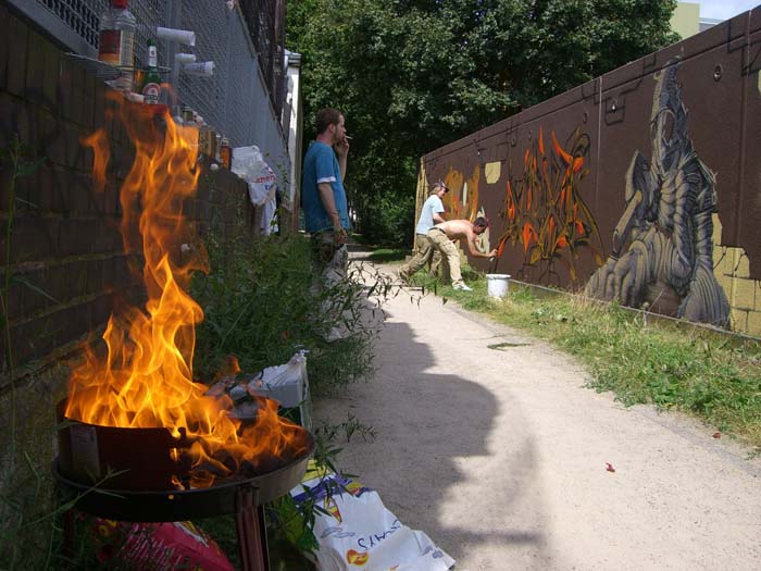 In der Innenstadt von Langenfeld wurde von 15 Sprühern ein Bauzaun bemalt. Auch wir waren dabei. Es wurde neben Schriftzügen, einer Skyline, auch typische Wahrzeichen der Stadt Langenfeld eingebaut.